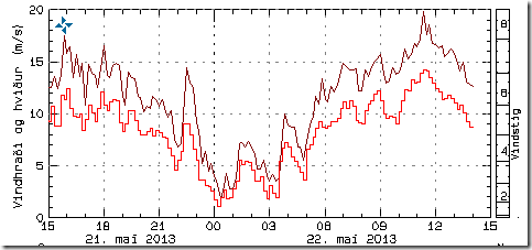 The wind direction in Reykjavik was northerly, like can be seen from the data from IMO below. The wind speed increased around noon, but still not very strong winds.