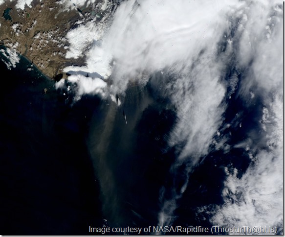 Clearly dust and ash blowing around in places, as seen in this satellite image from 13:15 on 14 April 2013. Fljótshverfi partially blocked by light cloud cover unfortunately, but second image below shows how it looked.